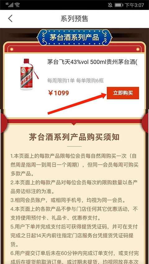 确认茅台相关信息无误后,点击“立即购买”按钮即可进入抢购流程,待开抢时间一到,就能第一时间参与抢购了。