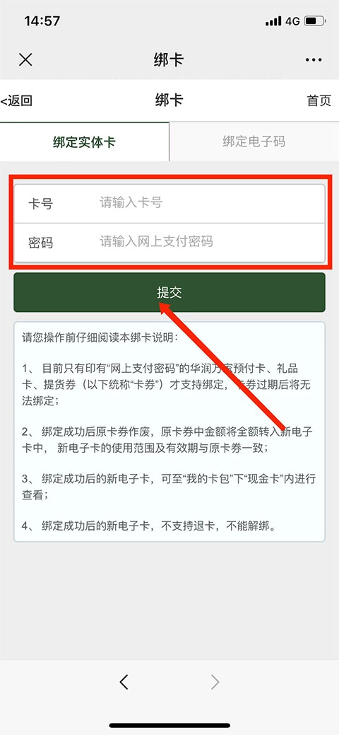 进入购物卡绑定界面后,依次填写“卡号”与“密码”信息,最后点击“提交”按钮,就能完成购物卡的绑定操作。