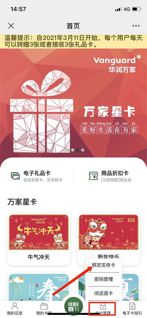 点击右下角的“卡片管理”,接着选择“绑定实体卡”这一选项,即可启动购物卡的绑定流程。