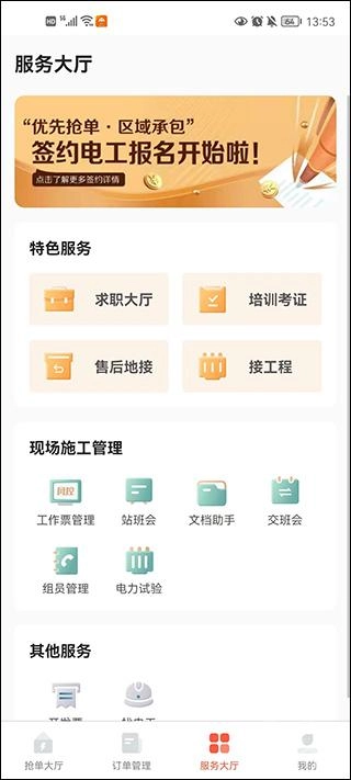 服务大厅提供求职、培训、承接工程等服务,同时具备工作票管理、站班会组织、文档助手等功能。