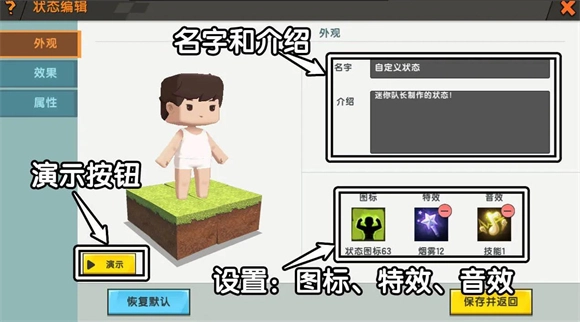 状态指的是角色当前身上具备的效果,例如当角色吃掉香溢面包后,状态栏就会呈现出快速恢复生命的状态。而这次更新推出的状态编辑器,能够让用户自行设置状态。