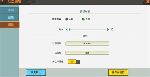 选好效果后,可对状态的属性进行设置,像持续时间、状态类型,以及复活后该状态是否会被清除等。完成状态设置后,还需配置获得该状态的方式,比如通过修改原版状态插件,再利用触发器来调取这个状态,如此才能使用新建的状态。