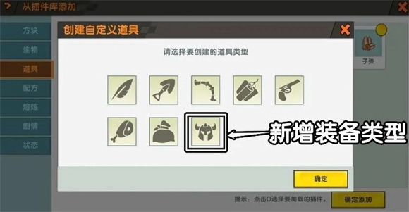 首先打开地图,接着点击顶部的插件按钮并进入道具界面。之后点击添加,再点击新建按钮来创建新插件,找到“创建新道具”选项;此时你会发现道具类型的最后新增了一个装备类型,这就是刚添加的自定义装备功能,选中该类型后点击确定,就能进入对应的编辑页面了。