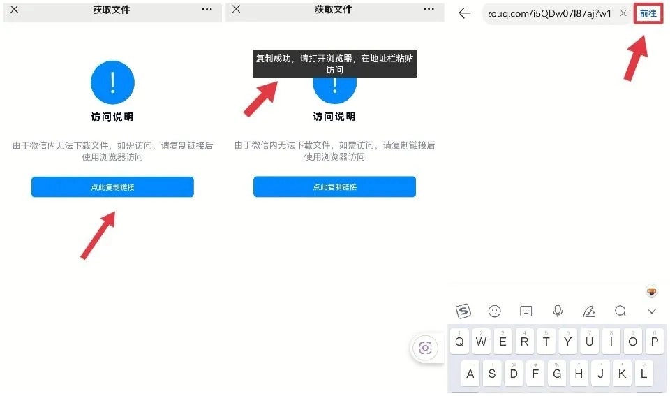 1以某款软件为例,点击链接后会跳转至“获取文件”页面,接着复制该链接,之后打开手机上任意一款浏览器,将链接粘贴进去并进行搜索。