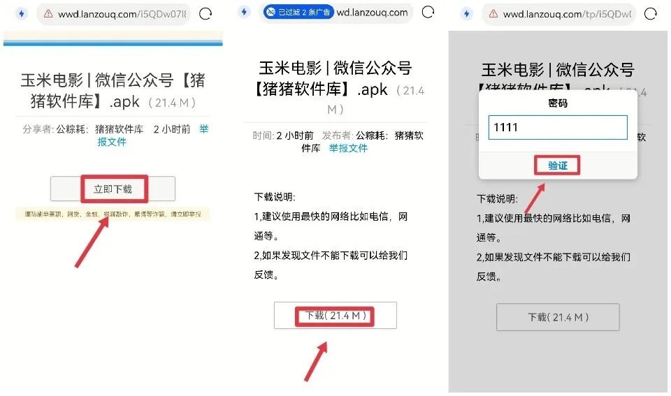 接下来跳转页面,先点击“立即”,再点击“”就会跳转到密码输入界面(密码已在后台回复的信息里注明),输入密码后(通常后台密码统一为1111),点击“验证”按钮即可。
