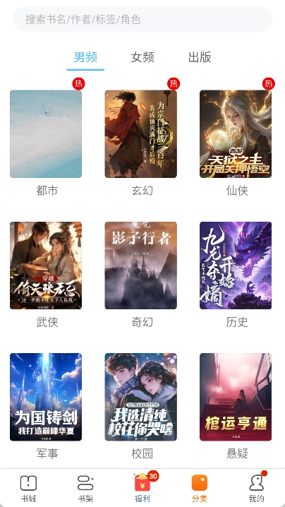 还设有详细的分类页面,方便用户选择男频或女频小说,浏览各类不同题材的作品。