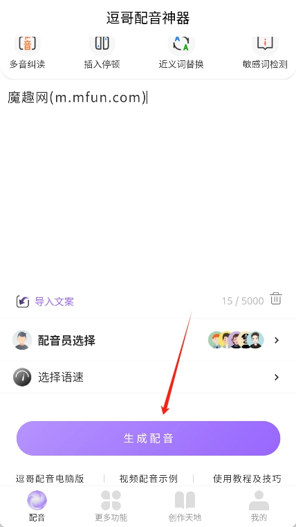 完成文本编辑操作后,点击“生成配音”按钮,系统会将文字内容转化为语音,同时在屏幕上呈现出转换后的文字字幕。