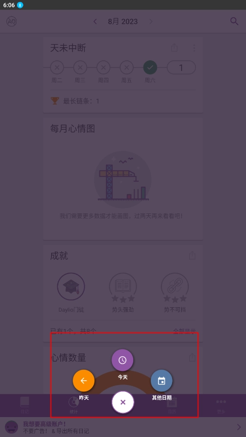 接着我们进入“统计”板块,在这里可以看到“每月心情图”“成就”“心情数量”等内容。