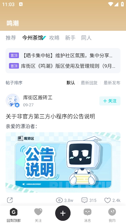 浏览帖子:用户在主界面能通过推荐、今州茶馆、同人等栏目查看各类帖子内容。