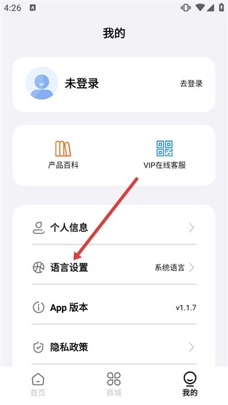 在【我的】页面里,找到【语言设置】这一选项,目前它显示的是【系统语言】,点击这个选项就能进入语言选择界面。