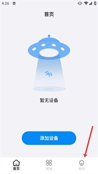 进入首页后,若看到“暂无设备”的提示,可点击“添加设备”按钮来关联设备;在底部点击“我的”,即可进入个人中心页面。