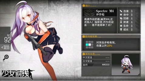 这是个适合新手使用的前排角色,主要因为没有明显短板,属于能力均衡的低星枪娘,其突出属性恰好是前排所需的回避能力。SpectreM4的技能是掩护专注,在持续时间内可提升自身闪避,很适合作为前期挑战BOSS时的前排选择。