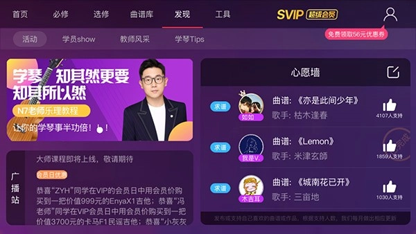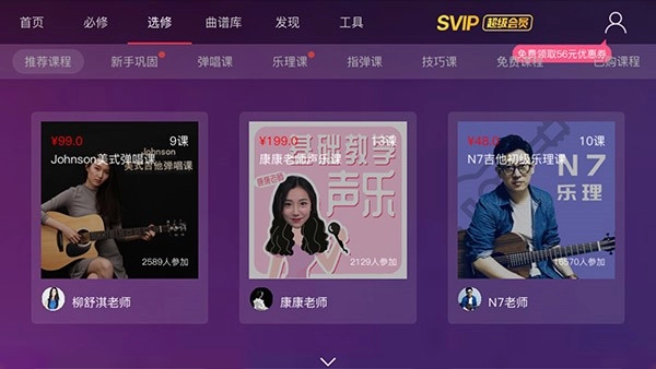 点击选修课程板块,里面包含推介课程、新手巩固、弹唱课、乐理课等不同类型的课程,大家可以根据自己的喜好挑选并购买学习。