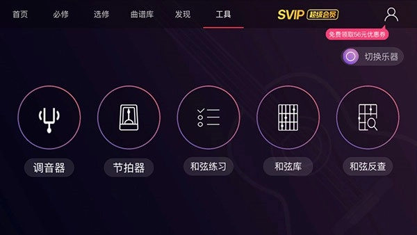 点击工具选项,这里提供了调音器、节拍器、和弦练习、和弦库以及和弦反差工具,可供我们使用。