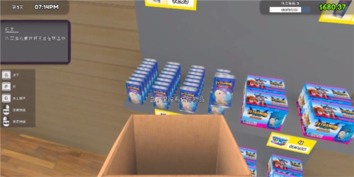 把装有卡包的箱子搬到店里后,就能对里面的产品进行上架操作了。当对准货架出现绿色框时,点击Throw按钮,卡包就成功上架了。