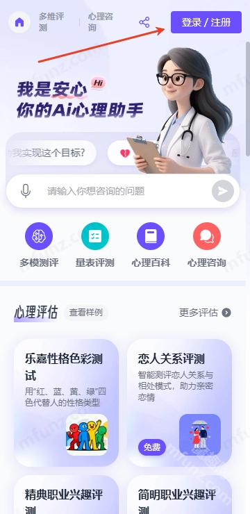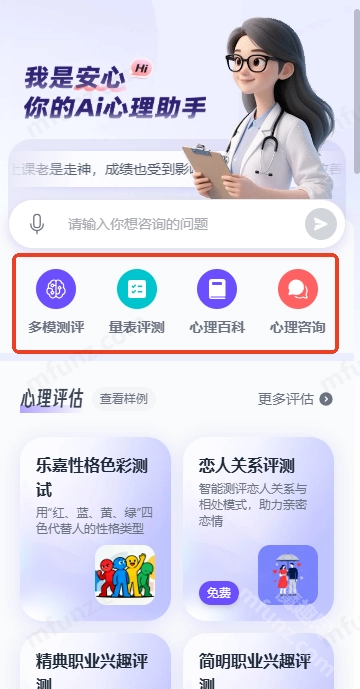 安心Ai是一款专注守护用户心理健康的专业智能心理服务助手。它具备多模测评、量表测评、心理百科与心理咨询等核心功能,依托国内领先的AI大模型及海量心理健康数据,为用户提供专业服务支持。用户进入安心Ai后,只需完成系统设置的问题,就能快速获取自身心情状况的分析报告,并根据评估结果得到专业的指导建议。