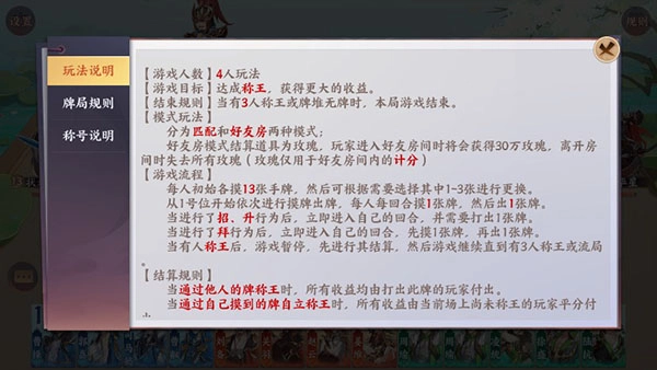 游戏在以下两种情况之一时结束:一是有三名玩家成功称王,二是牌堆中的牌被抽完。下面展示的是部分可用于称王的牌型,若您想了解更多牌型信息,可点击右上角的“规则”按钮,然后在弹出的界面中选择“称号说明”进行查看。