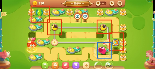 开局先用宠物搭配飞镖清理蓝框内的目标障碍,由于本关前4波怪物都是从左出口出现,所以在清除目标障碍后,可以适度清理右下角的其他障碍来积累金币。