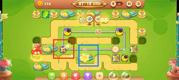 ③ 第7波(上图红框中的飞镖升级到顶级后,攻击范围能够覆盖左侧的障碍,搭配下图新增的炮塔,可在恰当的时机清除蓝框内的障碍):