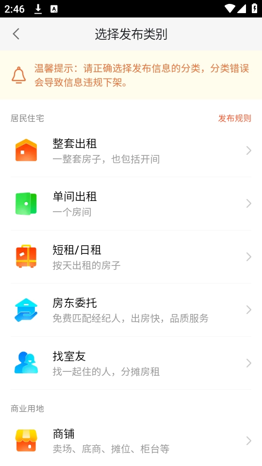 选择要发布的广告类型,包括租房、卖房或者二手车。