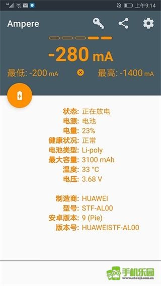 打开ampere应用程序,进入其主界面后,能够查看当前设备在未充电情况下的状态、电量、容量、温度、电压等各项参数。