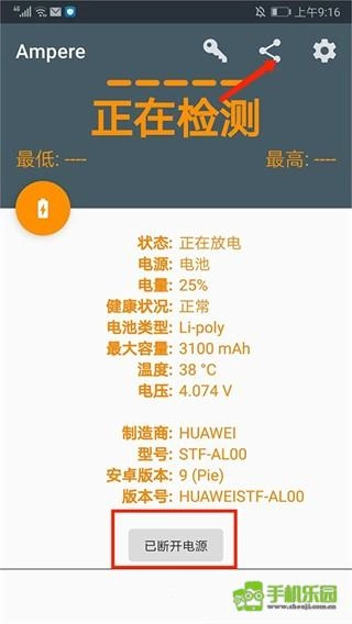 接着我们断开电源,然后点击右上方的【分享】图标,这样就能通过不同方式分享当前设备的电池数据了。