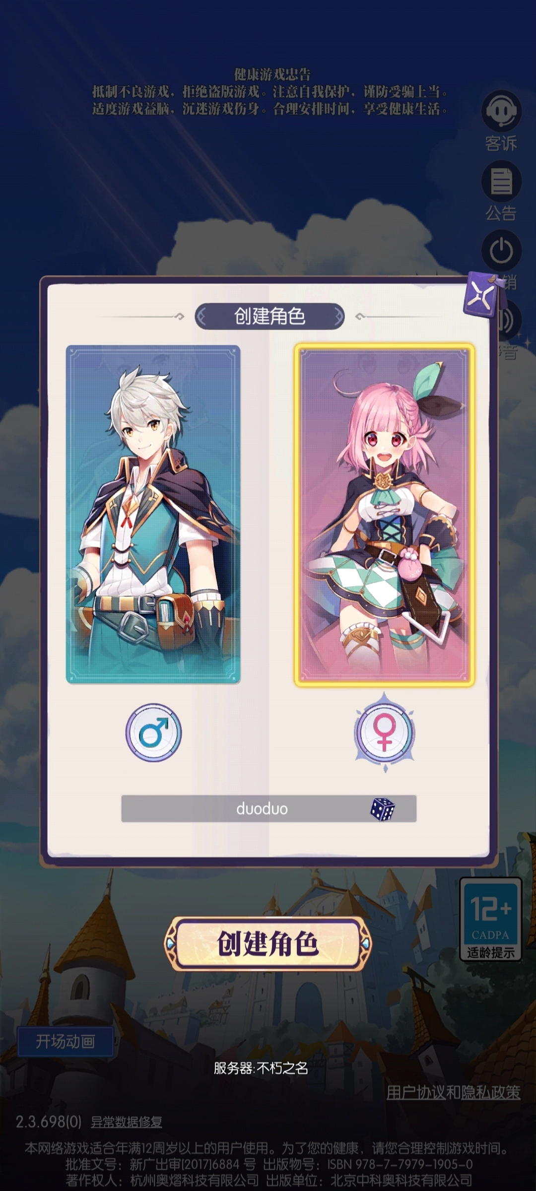 ③登录进去的首要任务是创建角色,选定女性性别,并为角色取一个昵称。