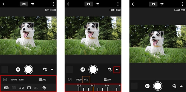 在遥控拍摄界面的下方,会依据相机模式呈现光圈值、快门速度、ISO等关键参数。轻触屏幕就能快速调整各项设置。点击右侧带有红框标记的拍摄设置按钮,还可以隐藏设置面板,从而简化界面布局。