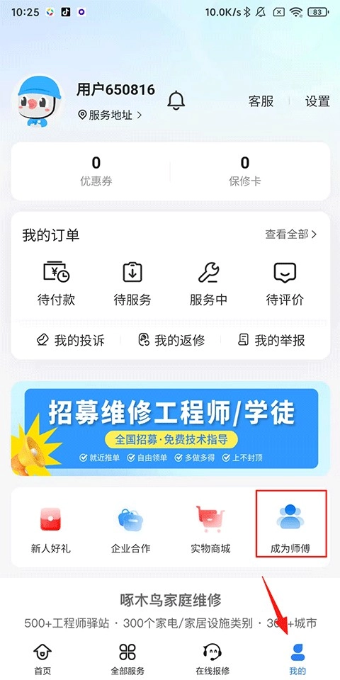 打开啄木鸟家庭维修,点击我的-成为师傅;