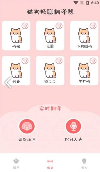 狗狗语音界面,多种狗狗常用的语音素材,你还能借助下方的两个识别功能,实现与狗狗的互动沟通。