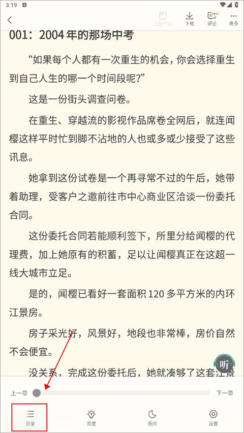 在阅读页面轻点屏幕,接着点击左下角的“目录”按钮,即可自由跳转到任意章节。