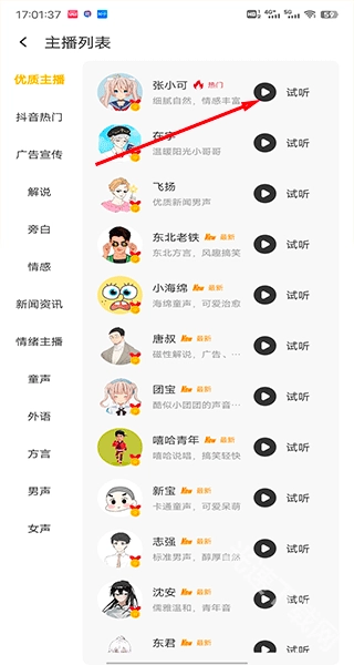 点击下方的主播按钮可以切换配音的声音,选择声音时还能试听效果。