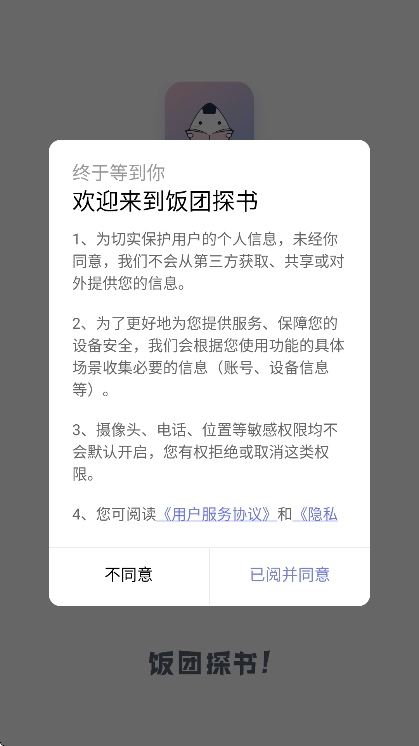 并安装饭团探书,首次进入软件须同意隐私权限。