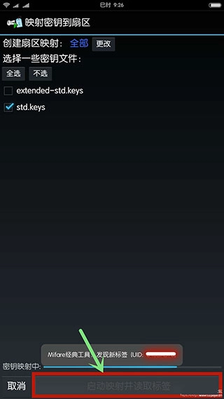 勾选刚才保存好的标签,选定之后点击软件底部的“选择转储”按钮来进行下一步操作(需要注意的是,这时候要把CUID空白卡放在手机的NFC感应区域内)。