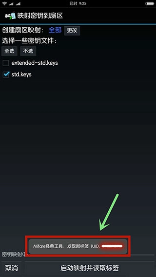 使用MCT读取加密门禁卡时,下方会显示“发现新标签(UID:……)”的提示。