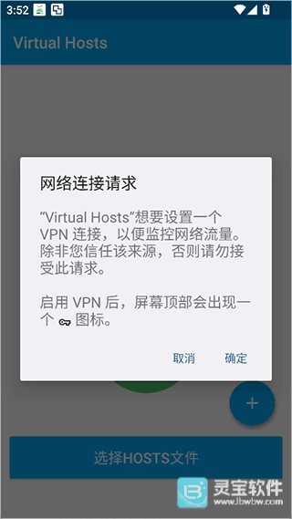 导入规则完成后,返回应用主界面并点击启动按钮,此时应用会申请创建本地VPN连接的权限,直接确认即可。