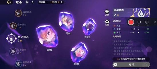 当一组意志内的所有水晶都达成相应的强化等级时,即可对该意志进行共鸣操作,以此提升整个组合的星级并获取丰厚的属性加成。