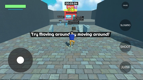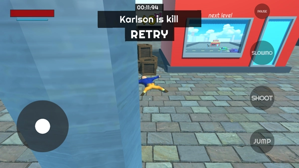 进入游戏后的界面如图所示,屏幕左侧的按键用于控制角色移动,右侧按键则对应攻击、跳跃等操作;只要成功操控卡尔森抵达商店,就能解锁并进入下一关。
