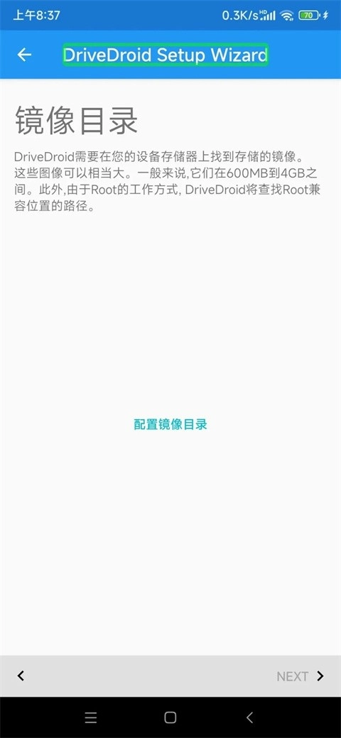 接下来要选择镜像的存放目录。点击【配置镜像目录】,系统会弹出存储权限的申请窗口,选择【允许】后,指定你想让DriveDroid使用的文件夹。确认【使用此文件夹】并再次点击【允许】,等程序加载完毕,再点击Next继续。