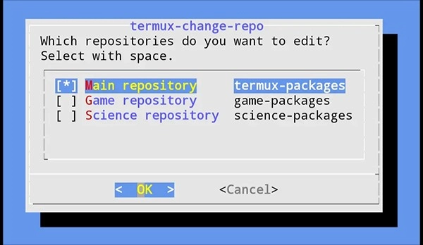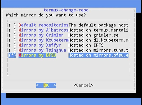 这里以清华大学开源软件镜像为例,在 Termux 中执行 `termux-change-repo` 命令即可进入如下所示的图形界面。