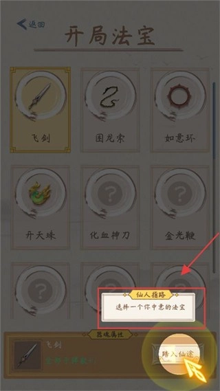 在法宝选择界面挑选你心仪的【飞剑】-【困龙索】等法宝,选定后点击踏入仙途继续修仙之旅。