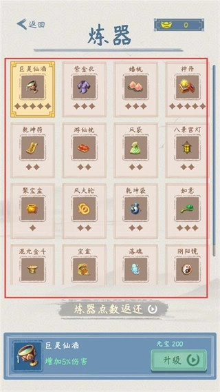 在炼器界面选择【巨灵仙酒】、【紫金衣】这类道具,消耗元宝进行升级,能够提升战斗属性,为修仙之路提供助力。