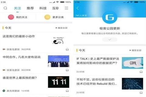 从发现栏的呈现来看,它其实和资讯类App很相似,只是多了语音朗读的功能。用户无需手动复制或搜索内容,只需关注自己感兴趣的频道,就能随时通过语音形式“听文章”。