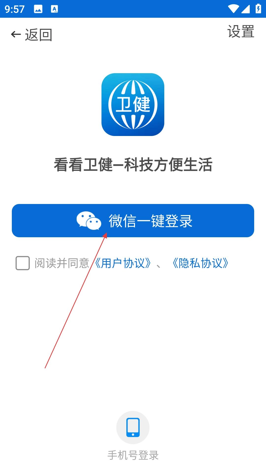 启动应用后,请仔细阅读并同意相关协议,随后进入登录界面,选择微信快捷登录的方式。