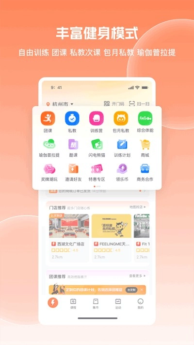首页定位调整至城市范围后,能快速查看离自己最近的门店、可预约的团课以及推荐的教练。