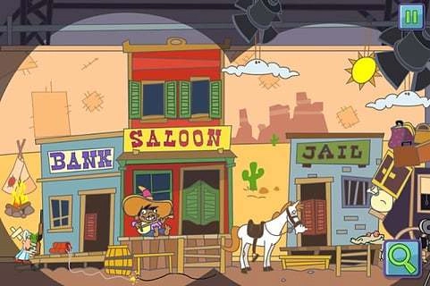 用枪射击水桶,右侧堆放杂物的横条,小丑的帽子,马头形状的物体,左边的云朵,左上方的布帘门,枪左侧的石头,左边的窗户。