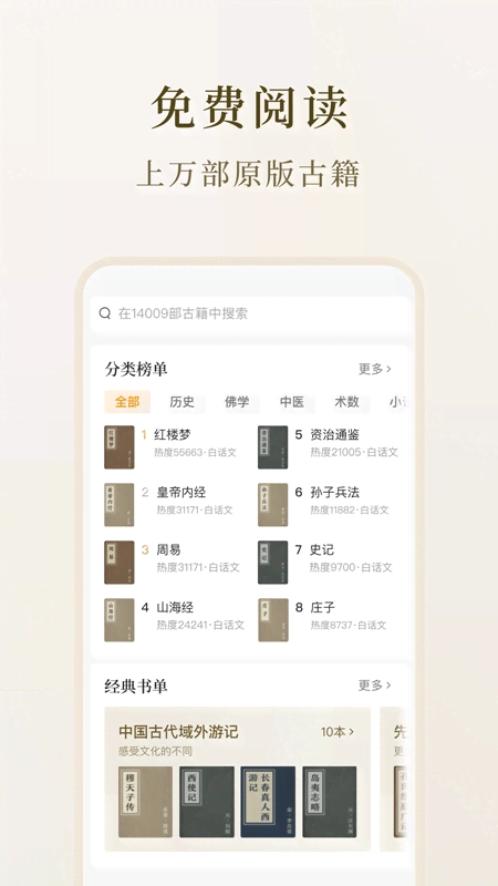 这款应用汇聚了历代典籍中的精华内容,涵盖经史子集等多个类别,全面覆盖中国传统文化的核心领域,能够满足不同层次使用者的阅读需求。