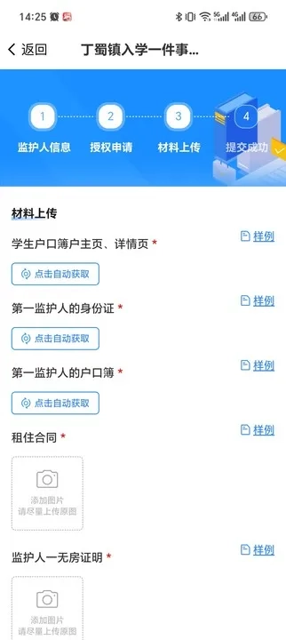 所有监护人完成授权操作后,需进入“监护人信息”模块进行材料上传与提交。系统会依据申请人所选指标,对应展示需上传的材料清单。户口簿等电子证照支持自动调取,申请人应仔细核对其准确性,确保材料内容无误且为最新版本。若系统未能成功调取电子证照,可通过手动方式上传相关材料。