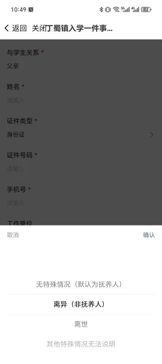 监护人填写时,可依据自身实际情况选择特殊情况选项。若学生父母已离异,可在“特殊情况”中勾选“离异”,同时在监护人材料上传环节提交离婚证。一旦选定特殊情况,相应的监护人信息便无需再行填写。待监护人信息填写完毕,点击“下一步”即可进入“授权发送”流程。