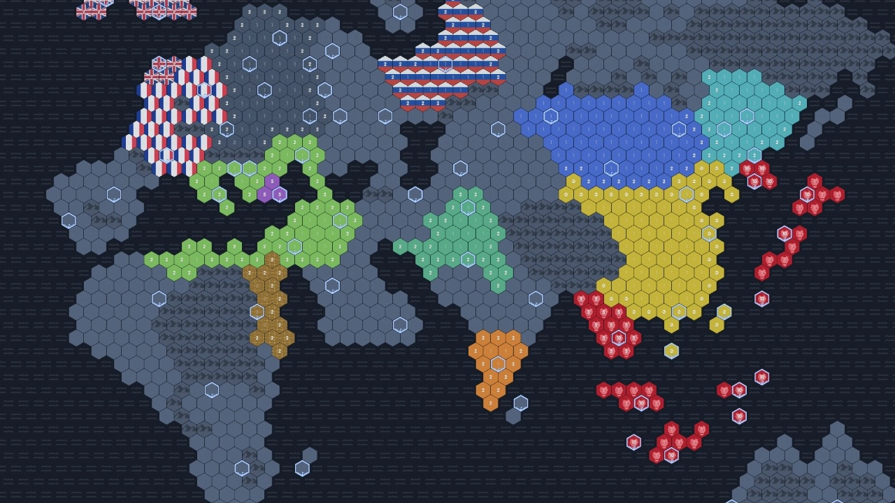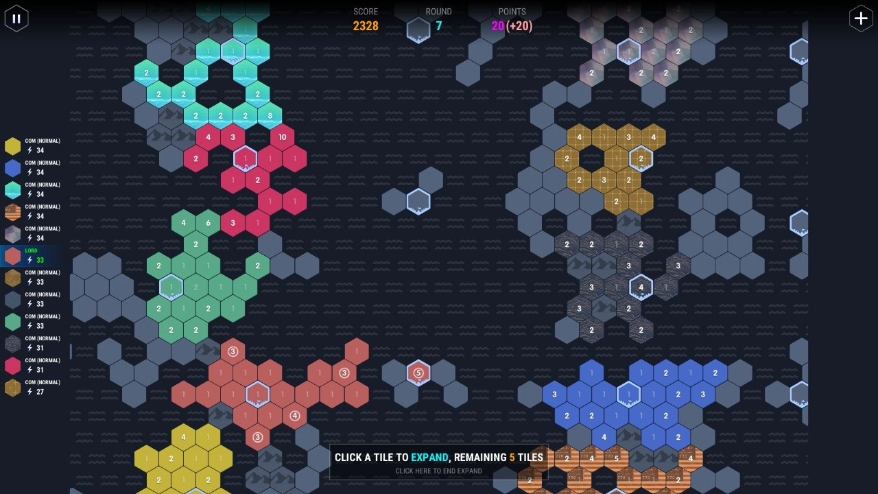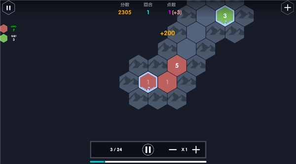 数字领主最新版本采用回合制玩法,玩家需要通过数字来占领地盘。每回合可以占领三块地,同时能为其中一块地增加五点点数,这相当于补充了五个兵力。游戏场景里存在一些无主区域可供扩张,但要注意若目标区域距离基地过远且中间没有己方兵种连接,则无法完成扩张。